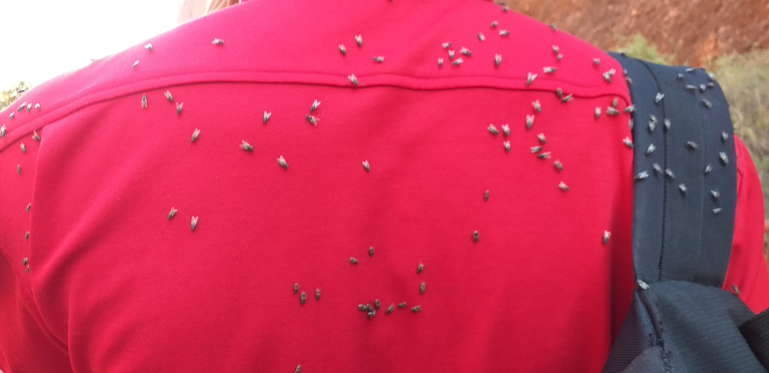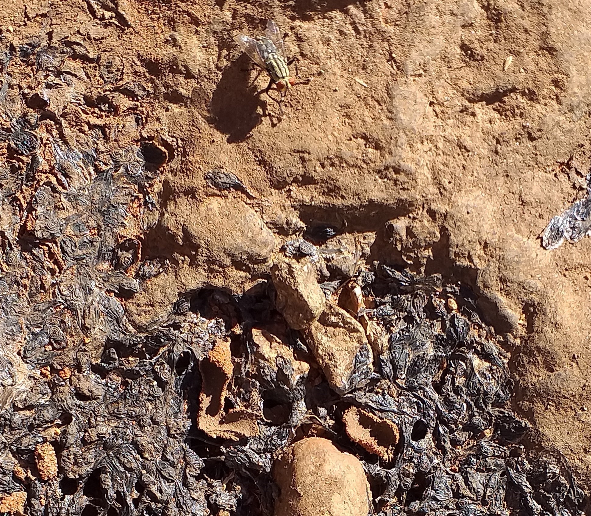 Our tour included visiting Uluru at sunset, and the next day we witnessed the first rays painting the rock with beautiful dark purplesBold beautiful colours and landscapes wherever we went. This is walking through Waipa Gorge in the Kata Tjuta Park.The flies were phenomenal everywhere we went! John and I gave in and wore nets over our faces so we weren’t having to spit the things out of our mouths. The nets went over out hats and elastic closed them at our necks. They were really effective and we became so used to them there, we drank our water without lifting the nets.Believe it or not, these are tadpoles. I came across a lot of these dark sludgy masses in depressions in rocks. I was told they dry up when the water disappears but the species of frogs continues to survive – this is just part of their life-cycle in this dry centre.Due to the on-going drought we came across wild brumbies crossing the road, numerous small groups of meandering camels and then, a lizard in the loo, all searching for food and water I guess.Just a section of a large piece of Aboriginal art I spotted in the airport as we were leaving.